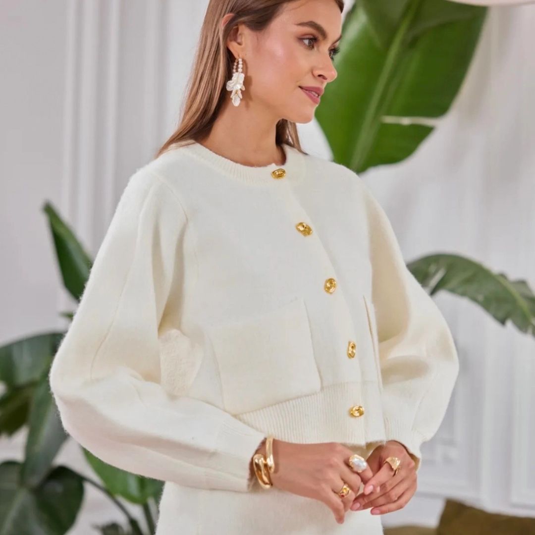 The slightly relaxed straight cut creates an easy silhouette that layers beautifully over different outfits. Elegant gold jewelry-style buttons add a subtle touch of luxury, while the two large front patch pockets bring both practicality and charm. Perfectly paired with the Morotĩ Skirt, it creates a coordinated set that feels modern, comfortable, and timeless.