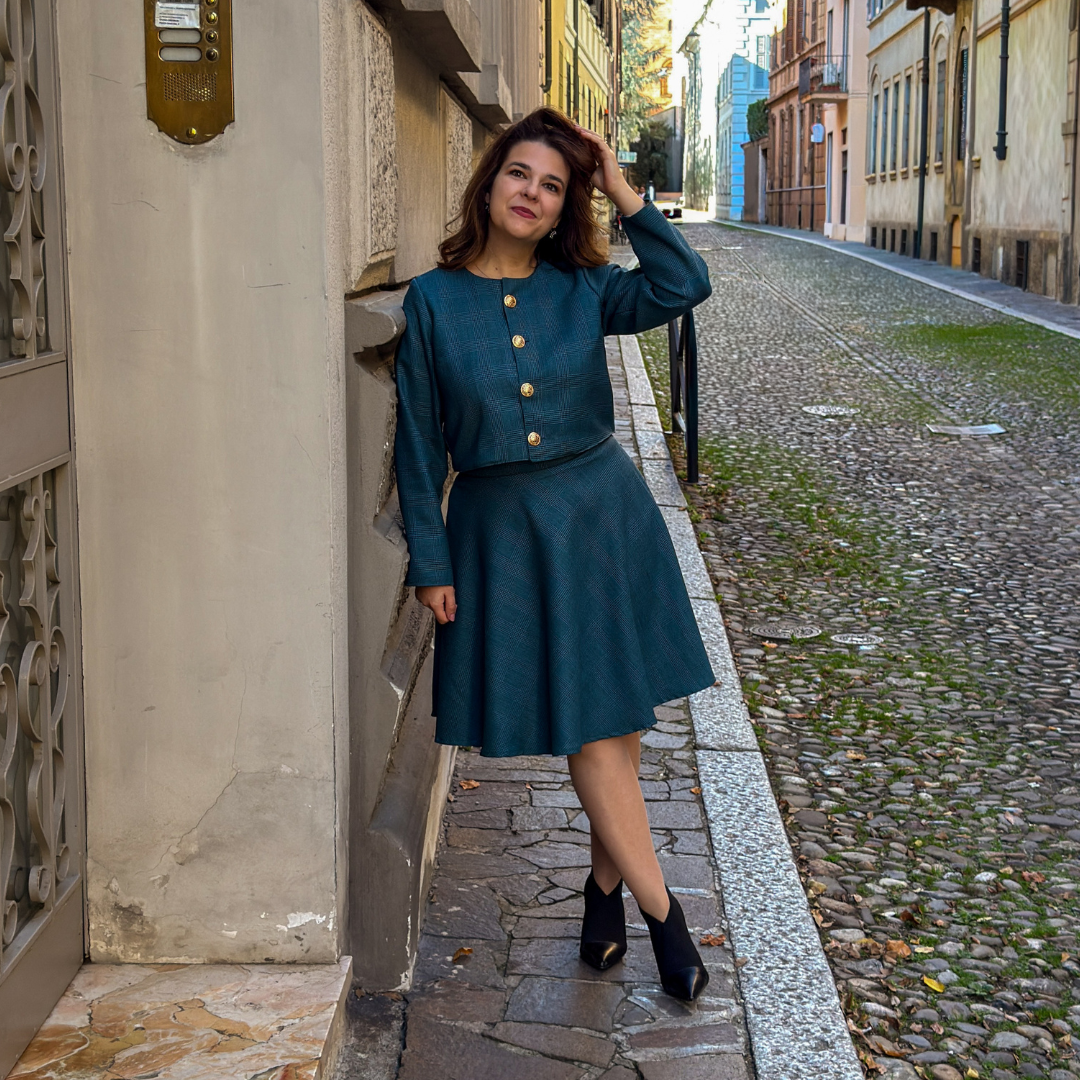 The cropped silhouette enhances your natural proportions with graceful precision, while the polished golden buttons add a touch of understated luxury. Fully lined in soft viscose, it offers a smooth, comfortable feel that complements its refined tailoring.